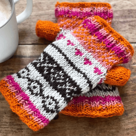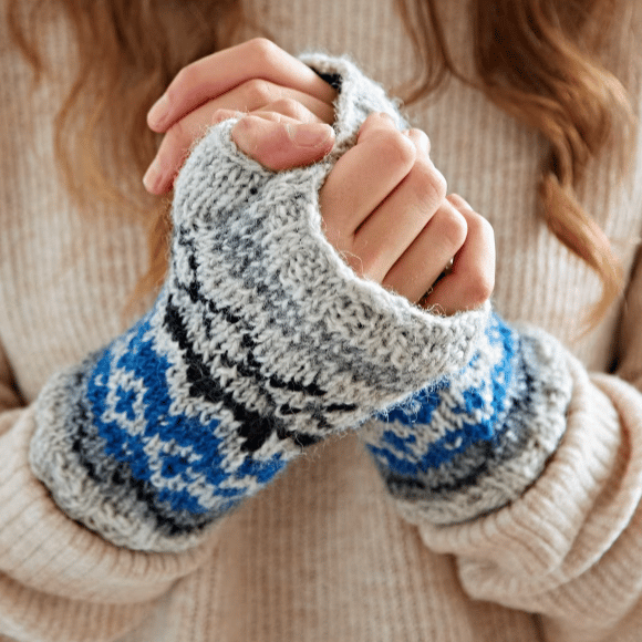Our colourful knitted fingerless gloves are lovingly handmade by Fair Trade artisans. The 100% wool design and soft fleece lining will keep hands extra toasty through the colder months.